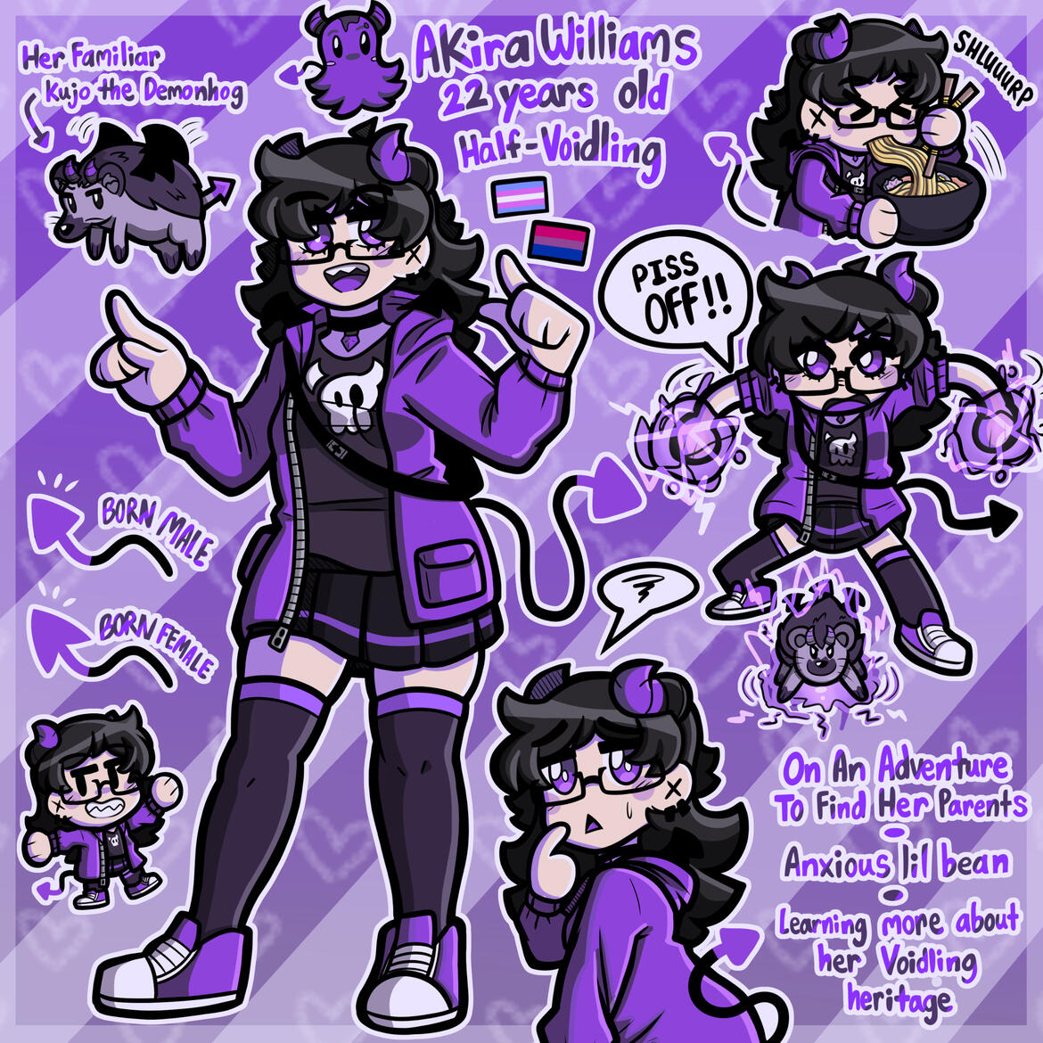"AKIRA WILLIAMS... what an absolutely fascinating individual. voidlings have been all but extinct for well over a hundred years. i've studied voidlings my whole life but... i never thought i'd live to meet one. let-alone one as cute as her. it seems she has spent most of her life living in isolation and is now coming to terms with her voidling heritage. i taught her the basics of casting cinder magic and she's making great progress. to my surprise she's already obtained a familiar, which usually takes mages years. void magic is extremely powerful but she has a long road of ahead of her if she wishes to fully harness it.the world we live in does not deserve such a precious bean. for dozens of years, the general public has fallen for propaganda that insists that voidlings are not only inherently evil but also responsible for what was dubbed "the void storms" which are wrecking havoc all over the planet. i personally don't believe any of it.i hope she finds what she's looking for.
